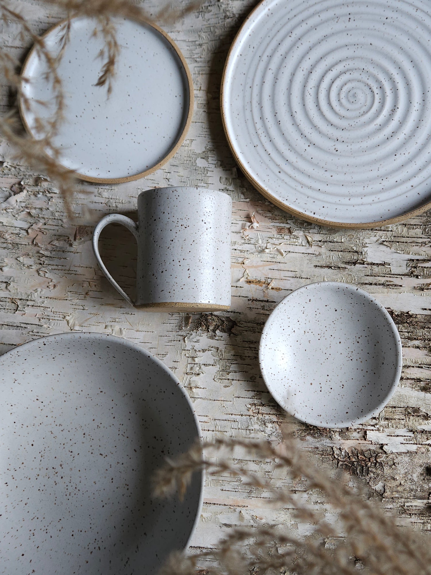 This glaze is a homage to the bark of the birch tree. Scattered charcoal specks on its smooth, matte-white surface mirror the subtle marks and textures found on the tree’s skin, adding an extra layer of character. The contrast between the pale white and dark specks captures the essence of the forest, embodying the quiet strength and elegance of the birch. This colour collection, named ‘Birch’, celebrates the tree’s natural beauty in its most refined form.