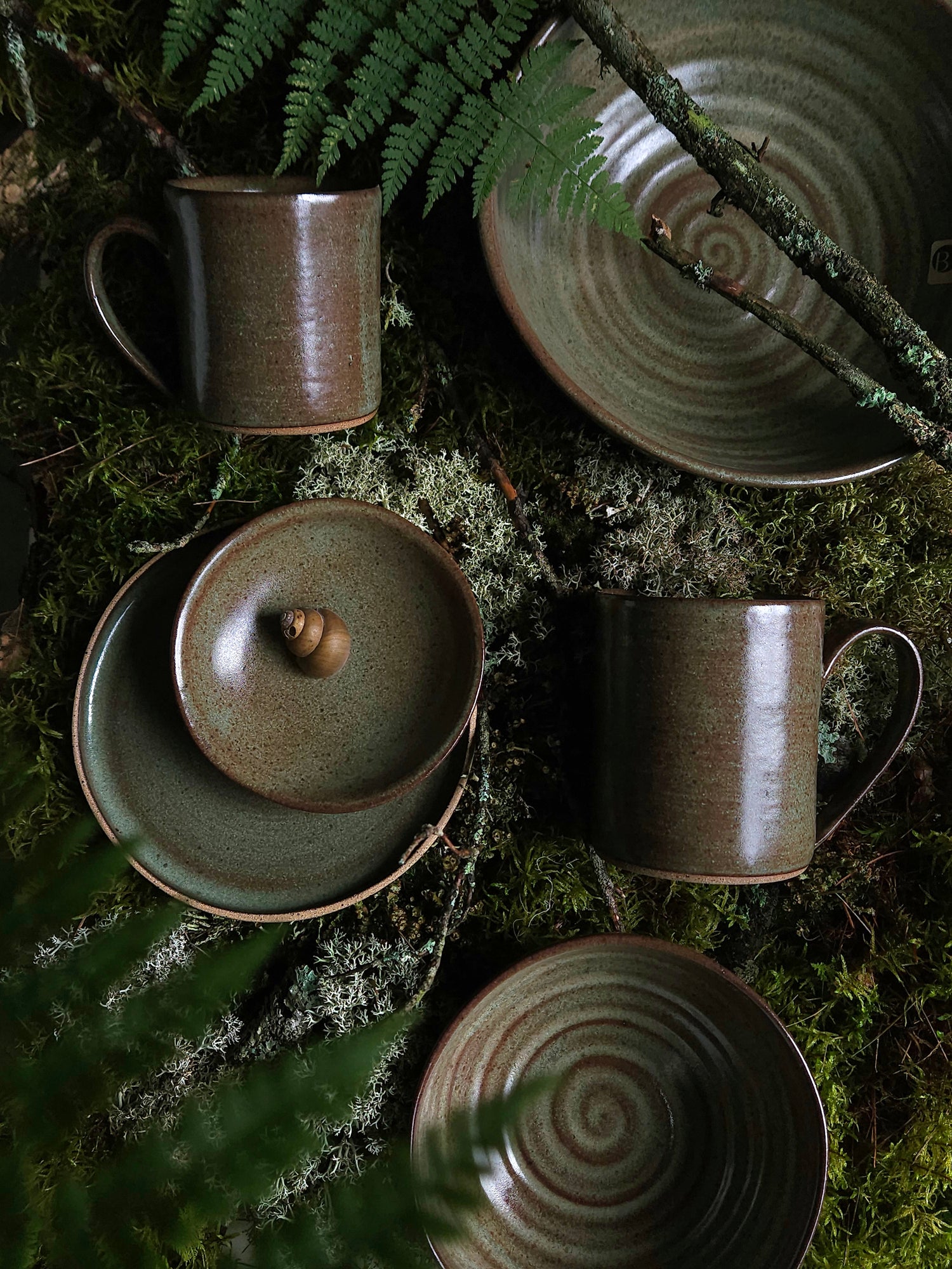 With a variety of hues, the Lichen glaze boasts subtle hints of minty greens with earthy undertones. Reminiscent of the life among a damp forest setting, growing in the nooks and crannies of rocks, decaying wood, and cascading from the trees among bogs. Often times creating a carpet on the forest floor, absorbing each footstep like a sponge after a fresh rainfall. A joyous reminder of one of my favorite hikes in Algonquin Park - Bat Lake Trail.