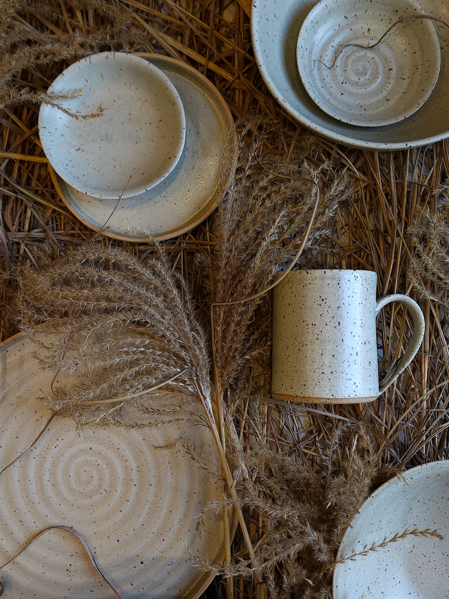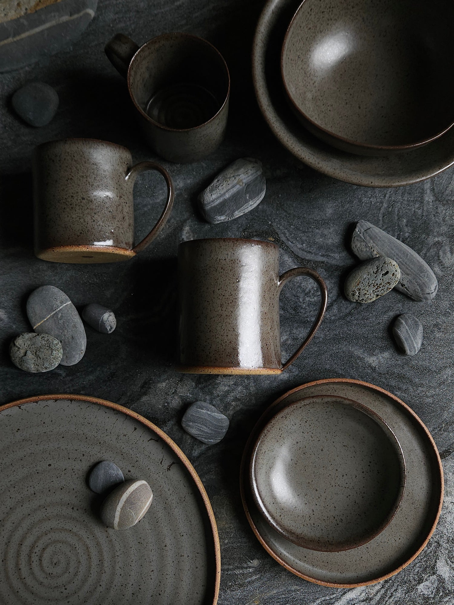 This collection of pots in 'Stone' carries the spirit of the east coast - a place of windswept shores and smooth stones shaped by the tides. This glaze's silky smooth satin-matte finish, flecked with dark specks, echoes the smooth beach stones found along the peaceful shorelines. Landscapes much different from home, but hold close to my heart, reminders of a place I've traveled often with family.